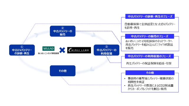 ミライラボとあいおいニッセイ同和損保は、資本業務提携契約を通じた取り組みを着実に進展させるとともに、寿命を迎えリユース・リセールが困難なバッテリーについても、リサイクルによる適切な資源化を図り、希少な金属や材料を再利用することで、一層の環境負荷軽減に貢献します。 また、全損認定となったEVバッテリーの活用にとどまらず、EVバッテリー自体の価値向上に資するサービスを両社で検討していきます。