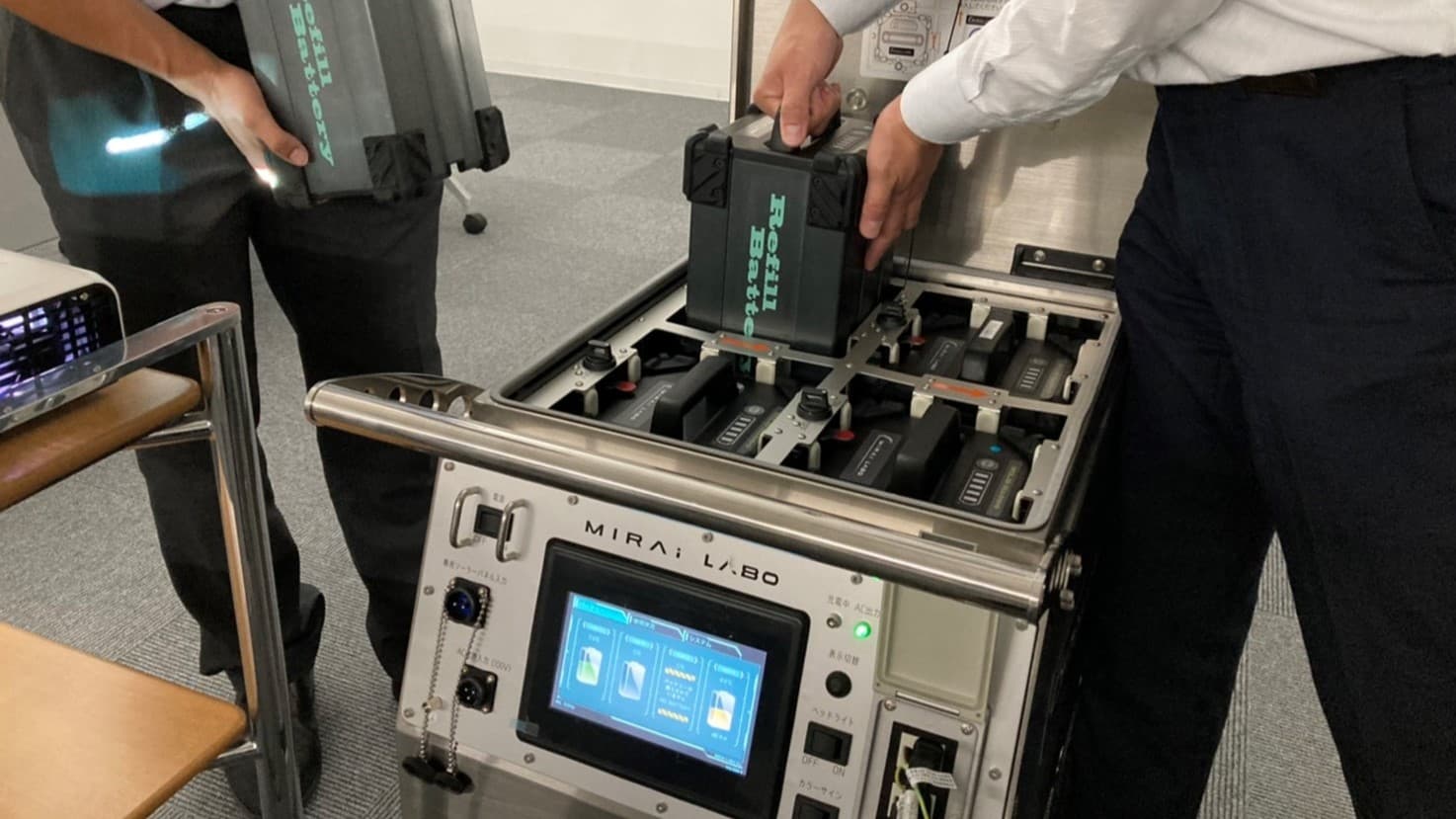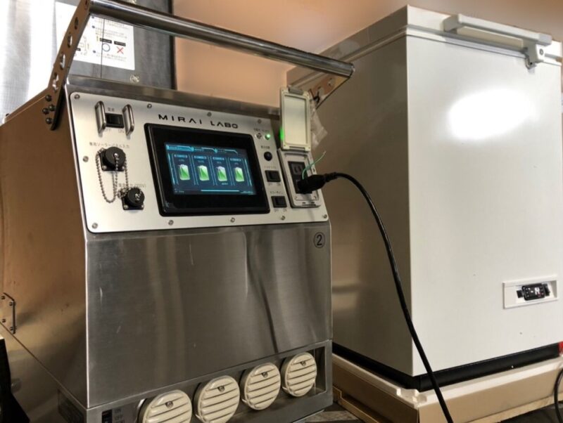 停電エリアでバッテリーを出力し、容量がなくなりそうになったら、通電エリアで充電しておいたバッテリーを持ってきて、その場でリフィル(詰め替え)します。