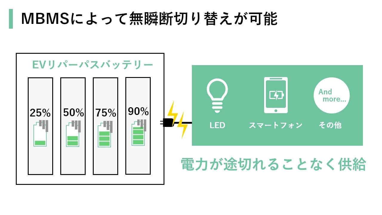MIRAI-LABOは、独自のバッテリー制御技術MBMSによりモビリティとは別の用途でEVバッテリーを再製品化(リパーパス)することで、GXに貢献します。